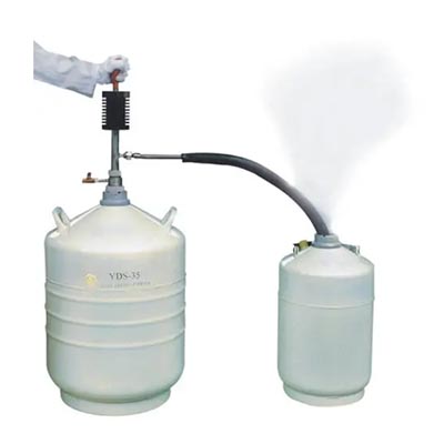 該產(chǎn)品依靠操作者手捏吸液球(ZYB-5型),使液氮容器內(nèi)貯存的液氮少量產(chǎn)生氣化。由于液氮的氣液體積比較大,氣化后的氮氣在密封的容器內(nèi)對盛裝的液氮增壓,促使容器內(nèi)盛裝的液氮排放出來,達到對其它容器補充液氮的目的。它具有操作方便可靠、排液過程中液氮的蒸發(fā)損失低的優(yōu)點。